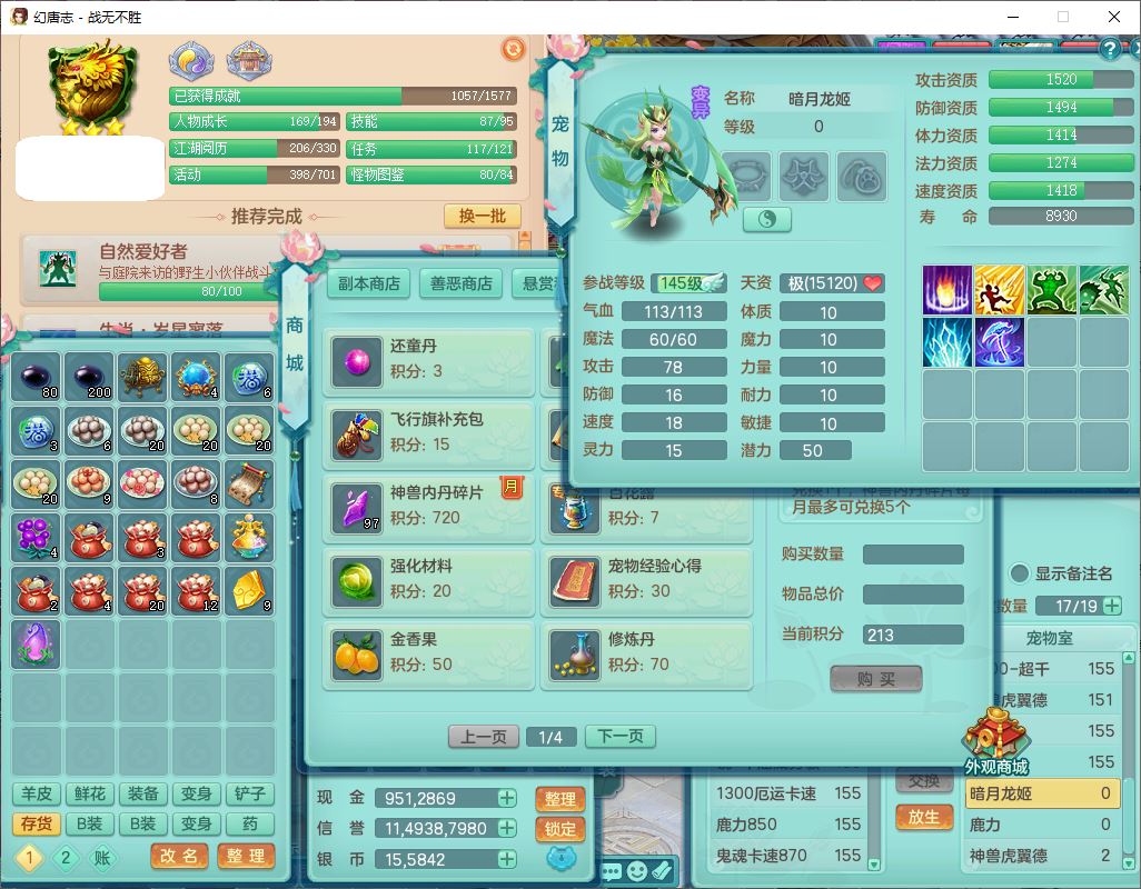 zw9185 战无不胜159男龙宫【潜龙过半+暴龙洪荒】精灵舞,2龙(换、无内)2内4六技能镜花1五技能金炉4特殊(羽袭、飞花、荒古、双星)2六技能龙姬胚子,6觉醒9六字1五字10四字综合17只满果子,9红装备,Y五雷帽子,击退烽火武器,270Y噬魔项链,法缭鞋子,一套物理星辰之拥装备,必杀群体止戈武器,破甲驾驭帽子,破甲鞋子,鼎5.5+70,3套符石,永久头饰、背饰、精灵皮肤,1双人飞行坐骑 QQ邮箱